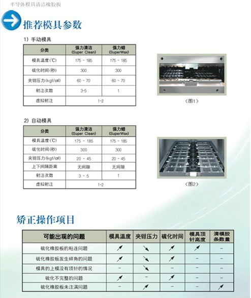 SUPER CLEAN清模胶条是一种用来清洗模具的橡胶, 适用于清洗半导体封装模具, 去除环氧塑封料树脂封装过程中型腔内形成的污渍。