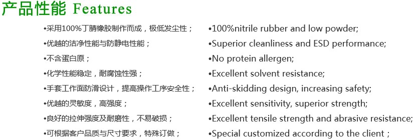 丁腈手套是由人工合成的橡胶制成,不含过敏性材料,不含硅离子和可塑剂(这些化学物质不仅对人体有害,而且还会污染洁净工厂的环境)。手套经过与防静电材料的混合工艺处理,能够在ESD敏感区提供厂区的ESD防护。